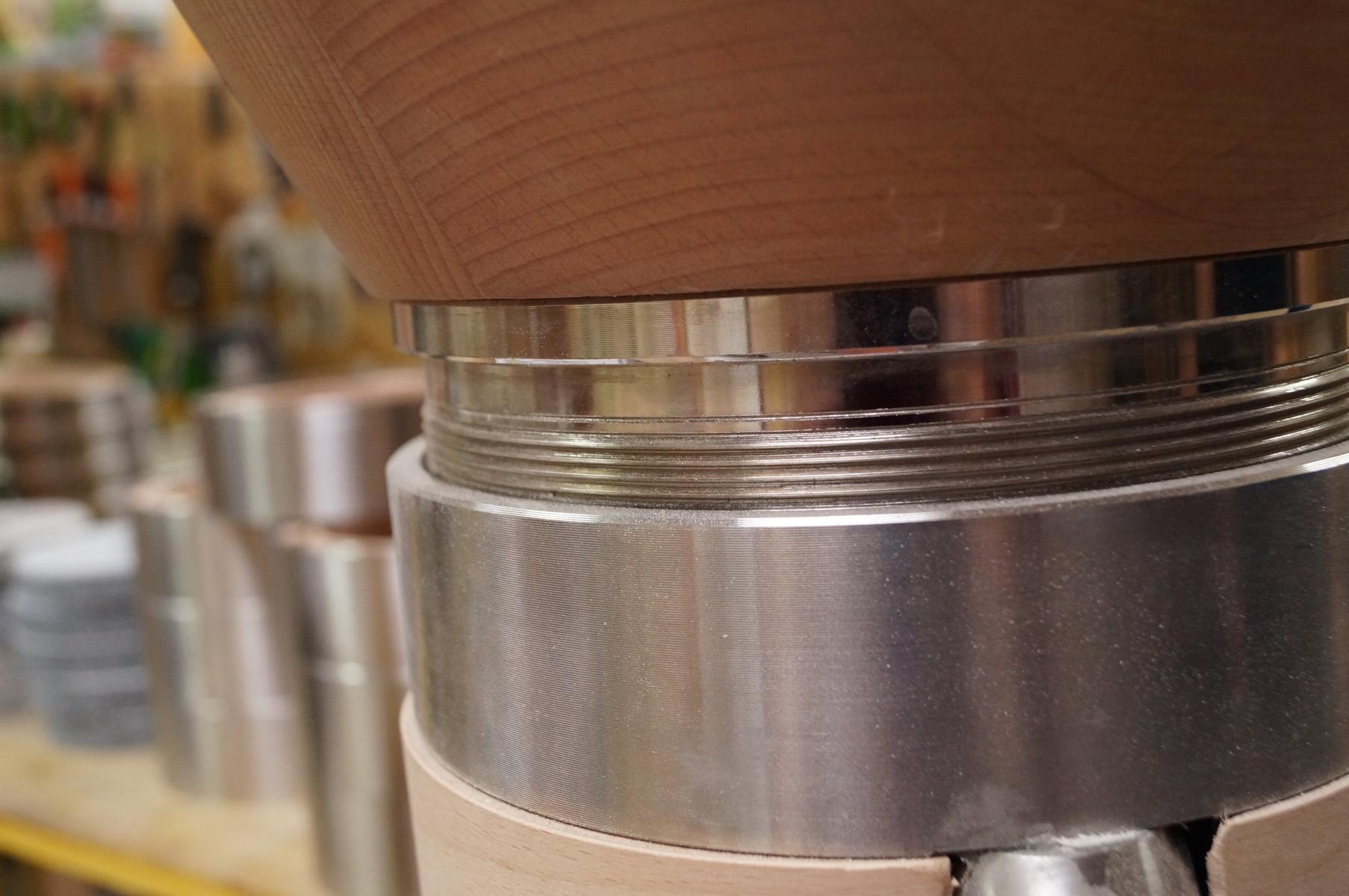 Since then, a precise steel thread, with the massive diameter of the mill housing, adjusts the distance between the two grinding stones.
