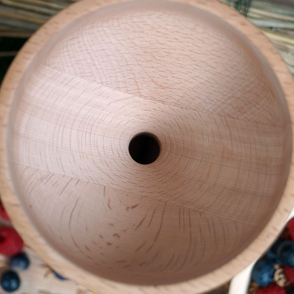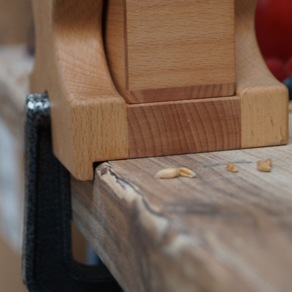 The round, finely crafted shape of the funnel is completely free of edges on the inside. This seamless production avoids residues of seeds and grains. This rules out the possibility of contamination. The hopper base plate forms the transition from the rectangular shape of the uprights to the round shape of the hopper. The hopper unit is attached to the uprights using 4 wooden dowels. The hopper unit can be removed without tools for cleaning work on the rollers. The hopper base plate also covers the front of the gear guard (child protection). Funnel removal – see operating instructions.
