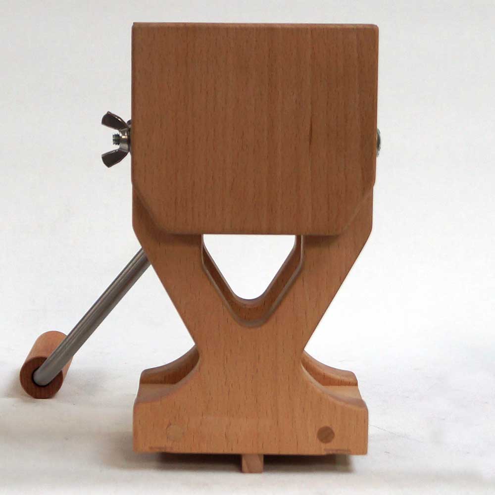 The hand crank is made of stainless steel and the handle is made of beech wood. The external thread is turned into the thread of the left-hand roller.