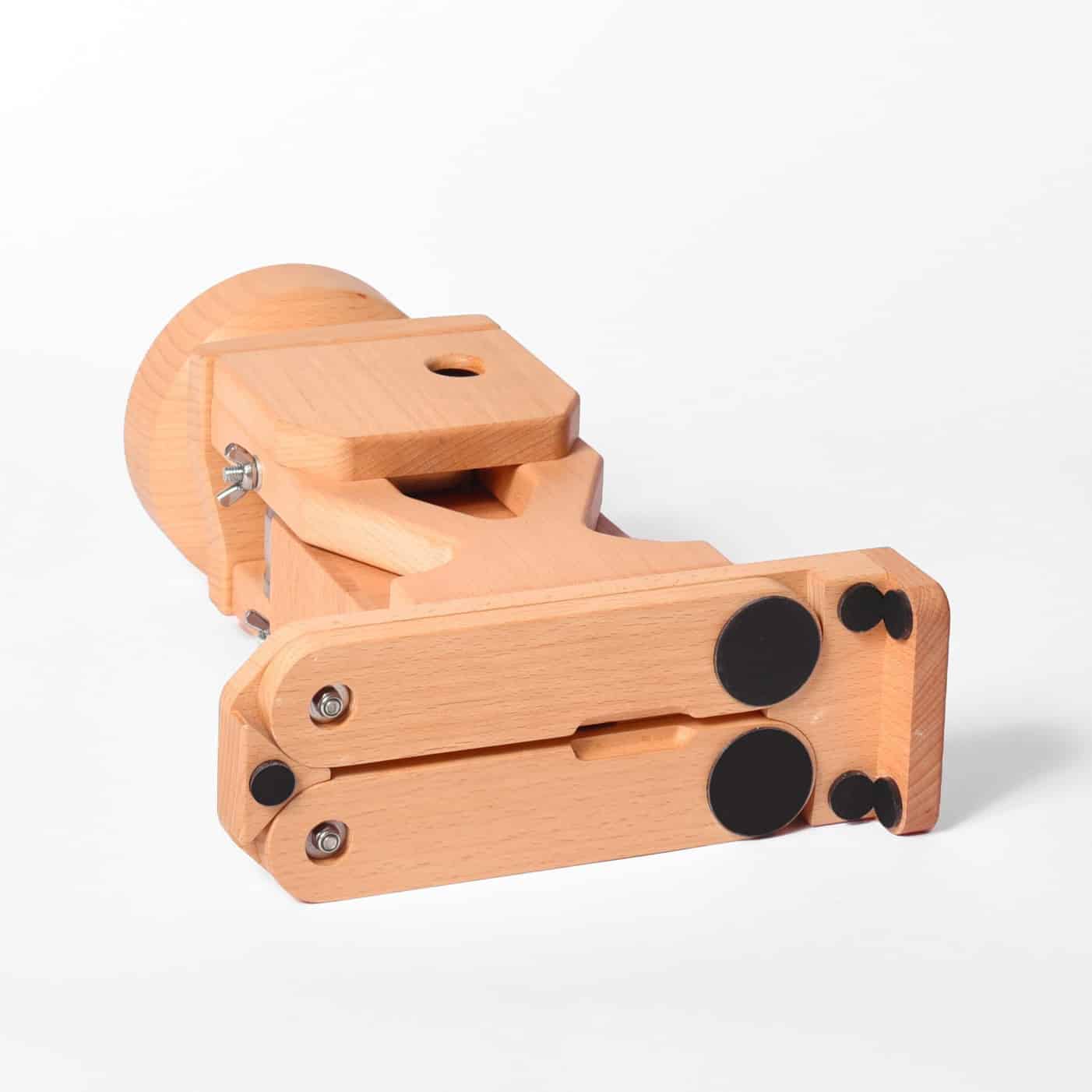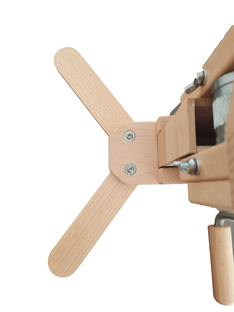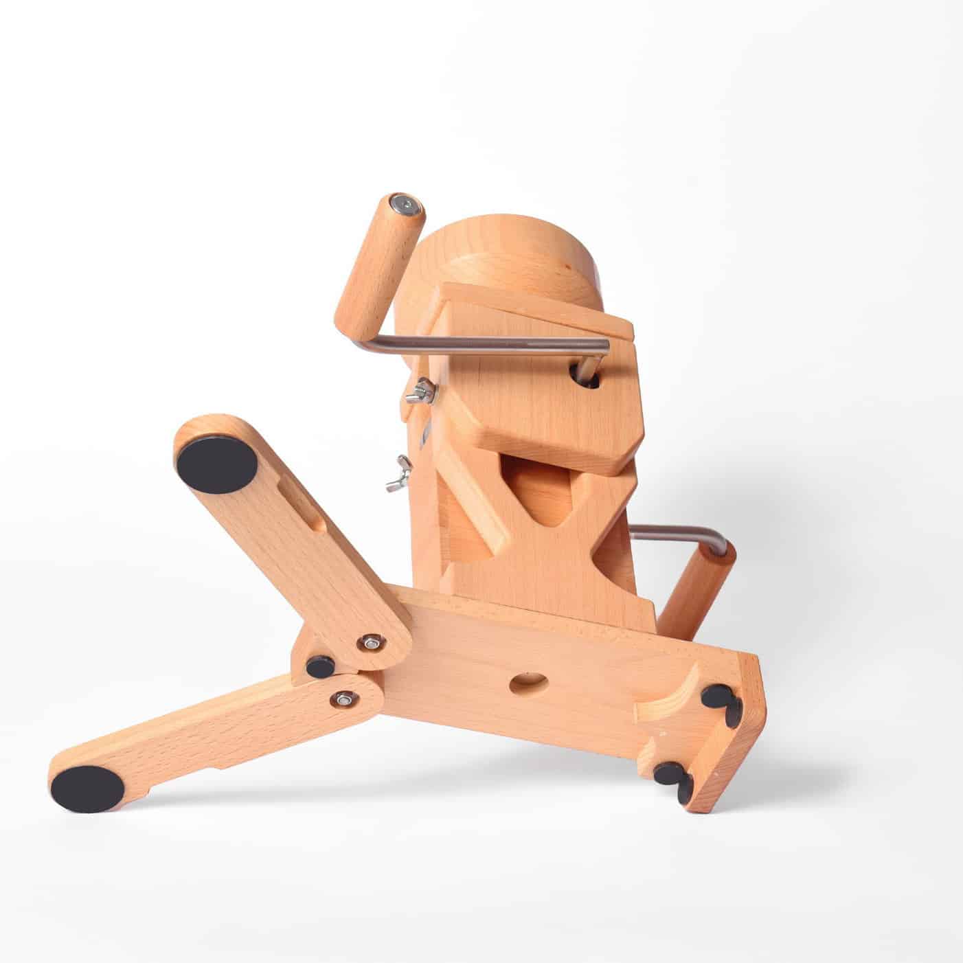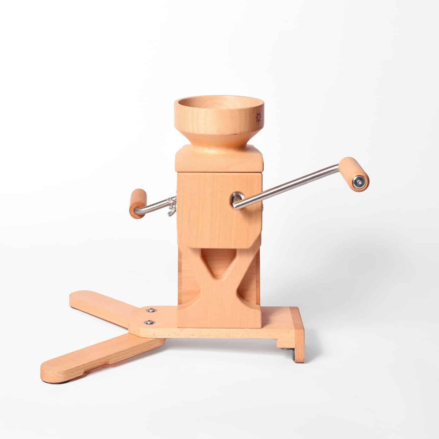 Magnet on the underside of the drawerEven delicate tables or flush work surfaces are suitable. The outriggers give “Pfiffikorn” a stable stand. Thanks to the double crank, there is no sideways tipping. Flaking is as easy as riding a bike with training wheels and effortless too.