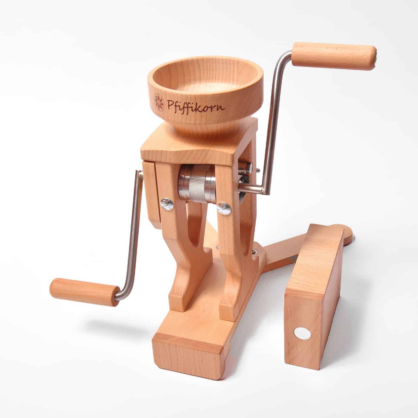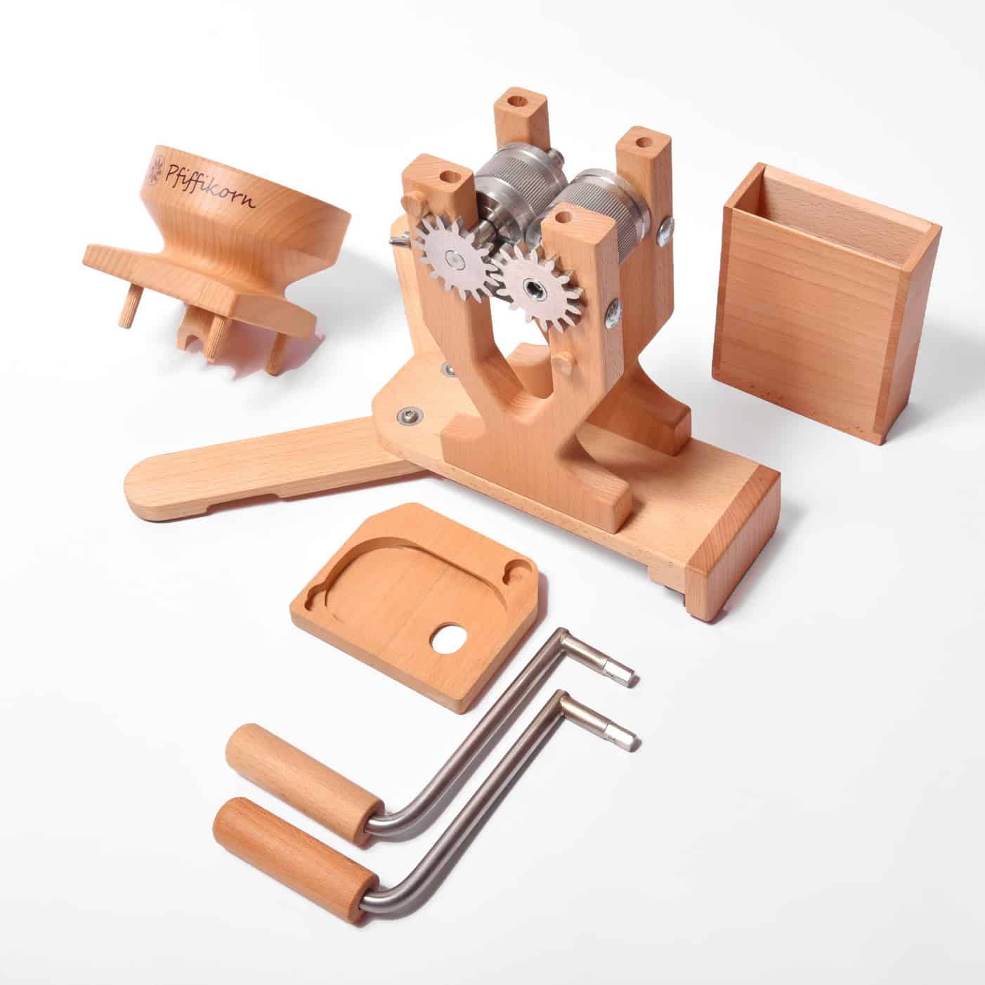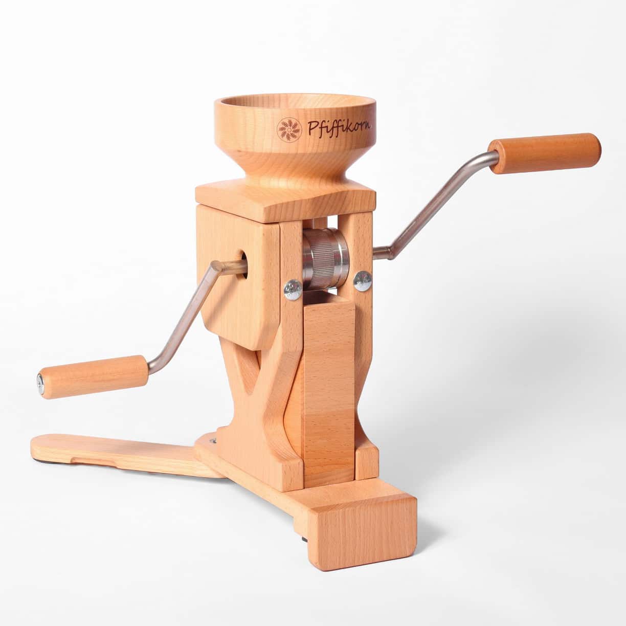 The “Pfiffikorn” is ready to use in a flash to make flakes for breakfast cereals or for baking, without the need to clamp it. Simply fold out the two arms to enlarge the standing surface, attach both cranks with quick-release fasteners and off you go.