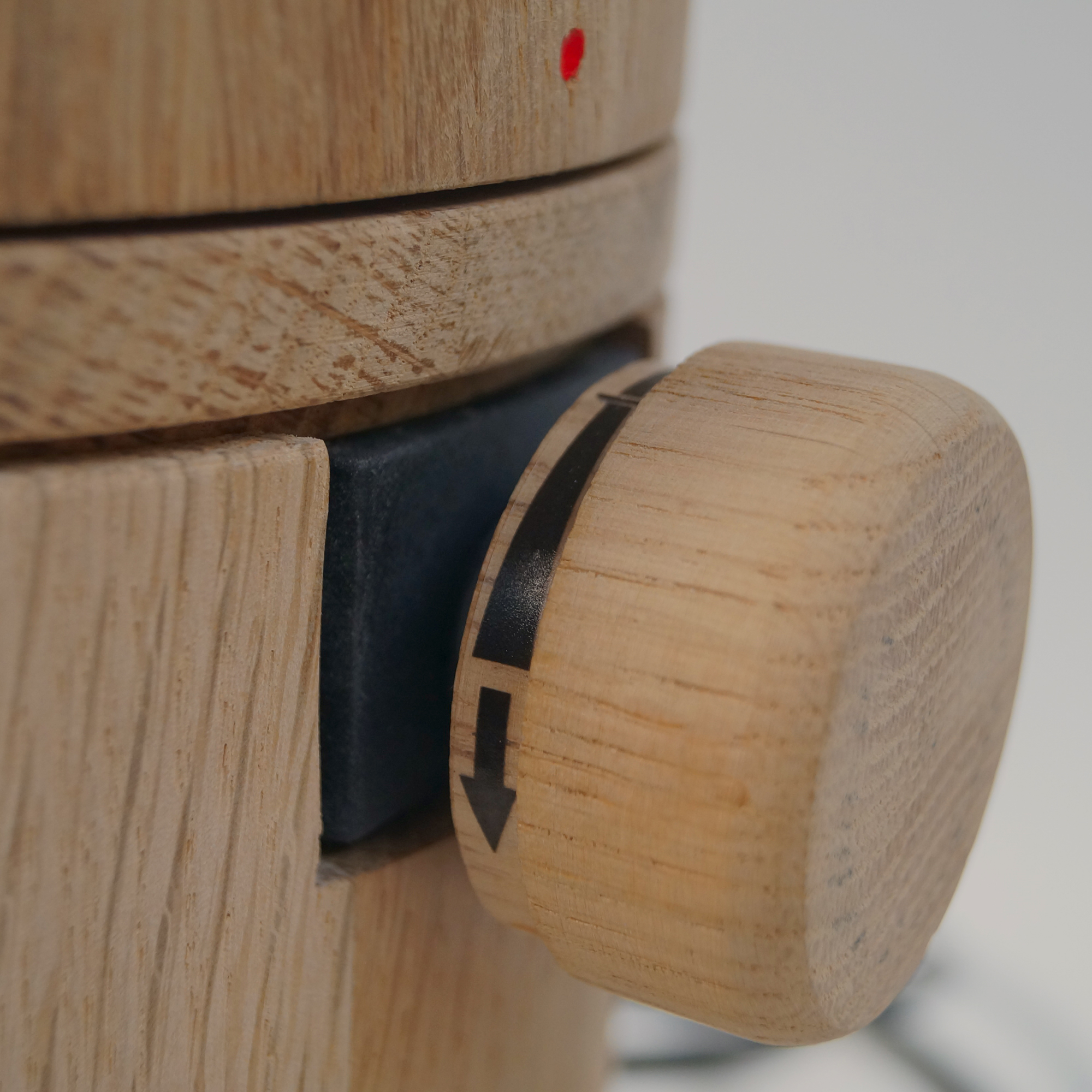 Dieser ist im oberen Drittel der Mühle seitlich angebracht und kann im Uhrzeigersinn oder gegen den Uhrzeigersinn gedreht werden.