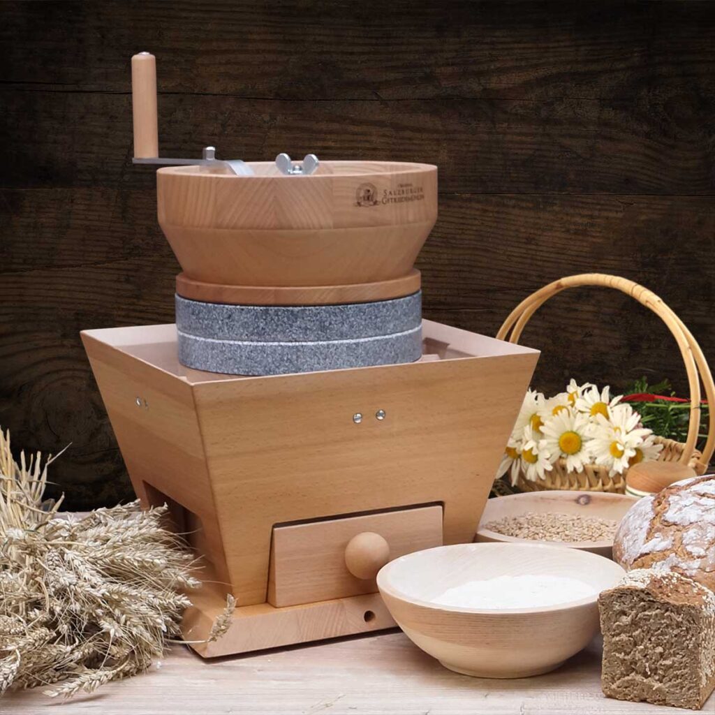 Neben unseren Salzburger Getreidemühlen, die mit Motoren eines österreichischen Herstellers funktionieren, haben wir auch Mühlen, die mit eigener Körperkraft betrieben werden können. Unsere beiden Salzburger Hand-Getreidemühlen MH 4 und MH 8 sind die beiden Modelle, mit denen per Hand frisches Mehl und frischer Schrot selbst gemahlen werden kann.